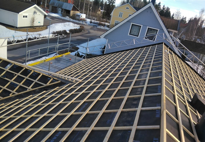 Detta tak har fått nytt undertak i form av råspontluckor, ny papp från Mataki, Ny strö och bärläkt 25x48mm. Detta har sedan pryds med nya vindskivor, gavellister och svarta betongpannor från Benders.